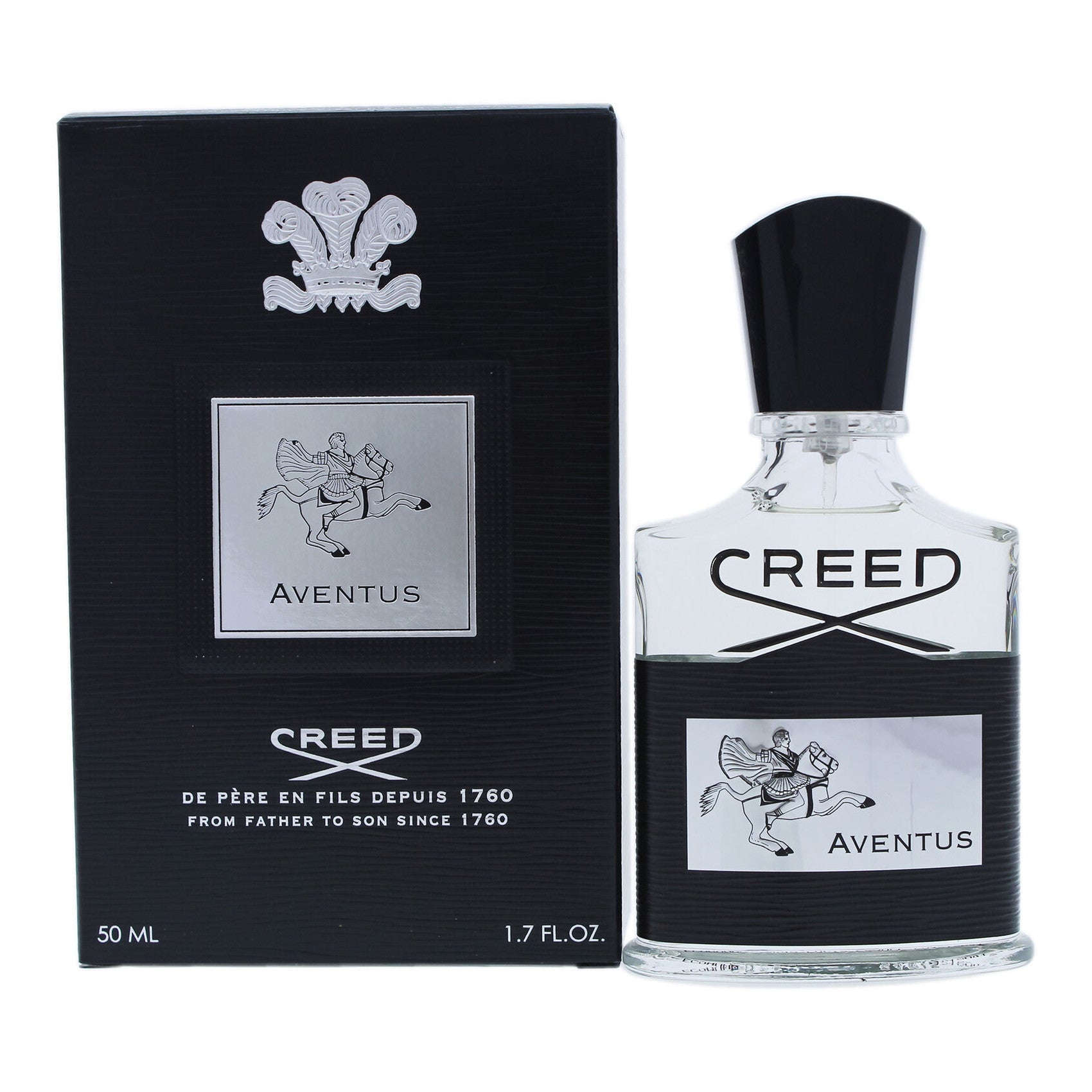Aventus celebrates strength, vision, and success, inspired by the dramatic life of war, peace, and romance lived by Emperor Napoleon. The bottle is emblazoned with a silver emblem of a horse and rider.