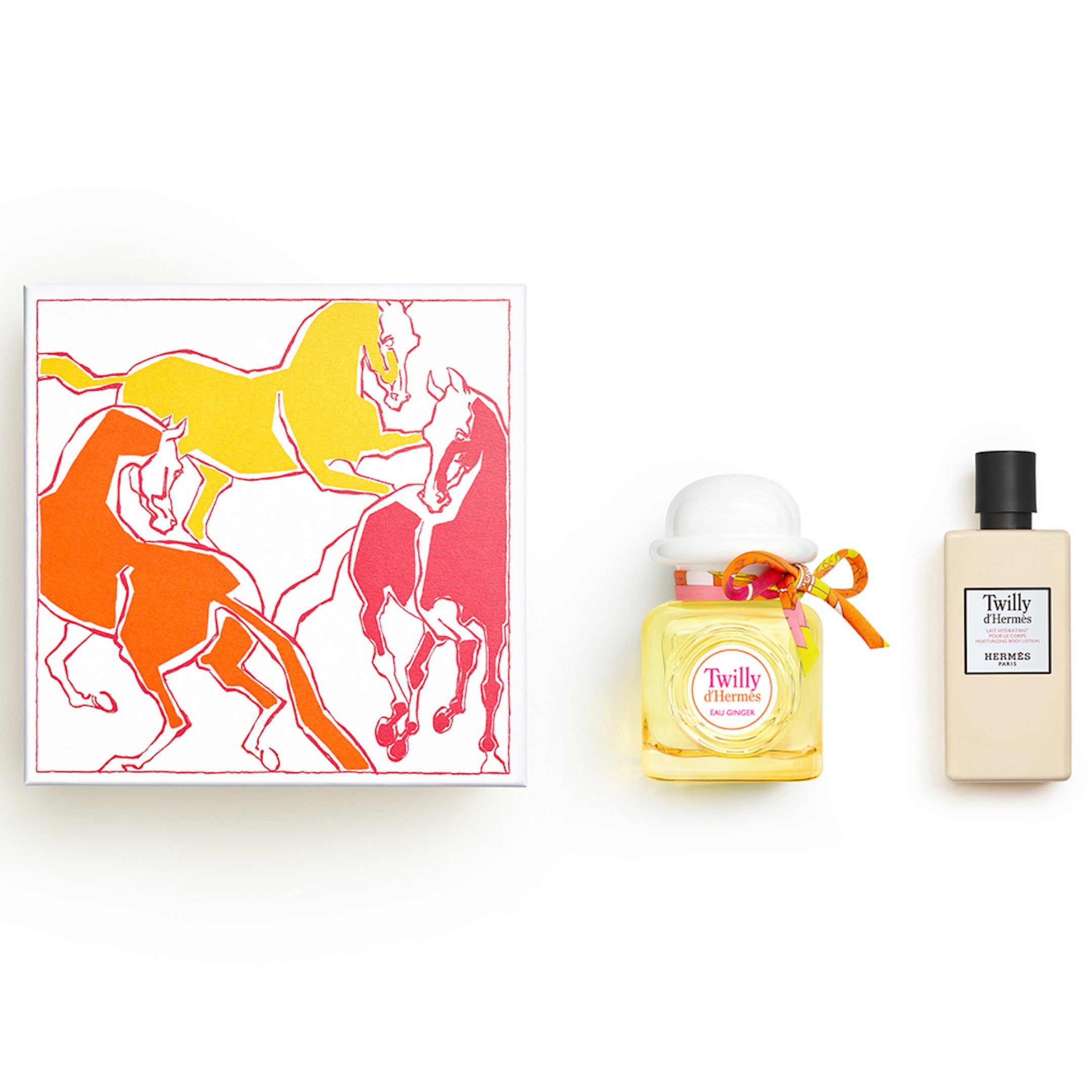 This gift set comprises one 85 ml Twilly Eau Ginger Eau de Parfum and one 80 ml Twilly d’Hermès moisturising body lotion.