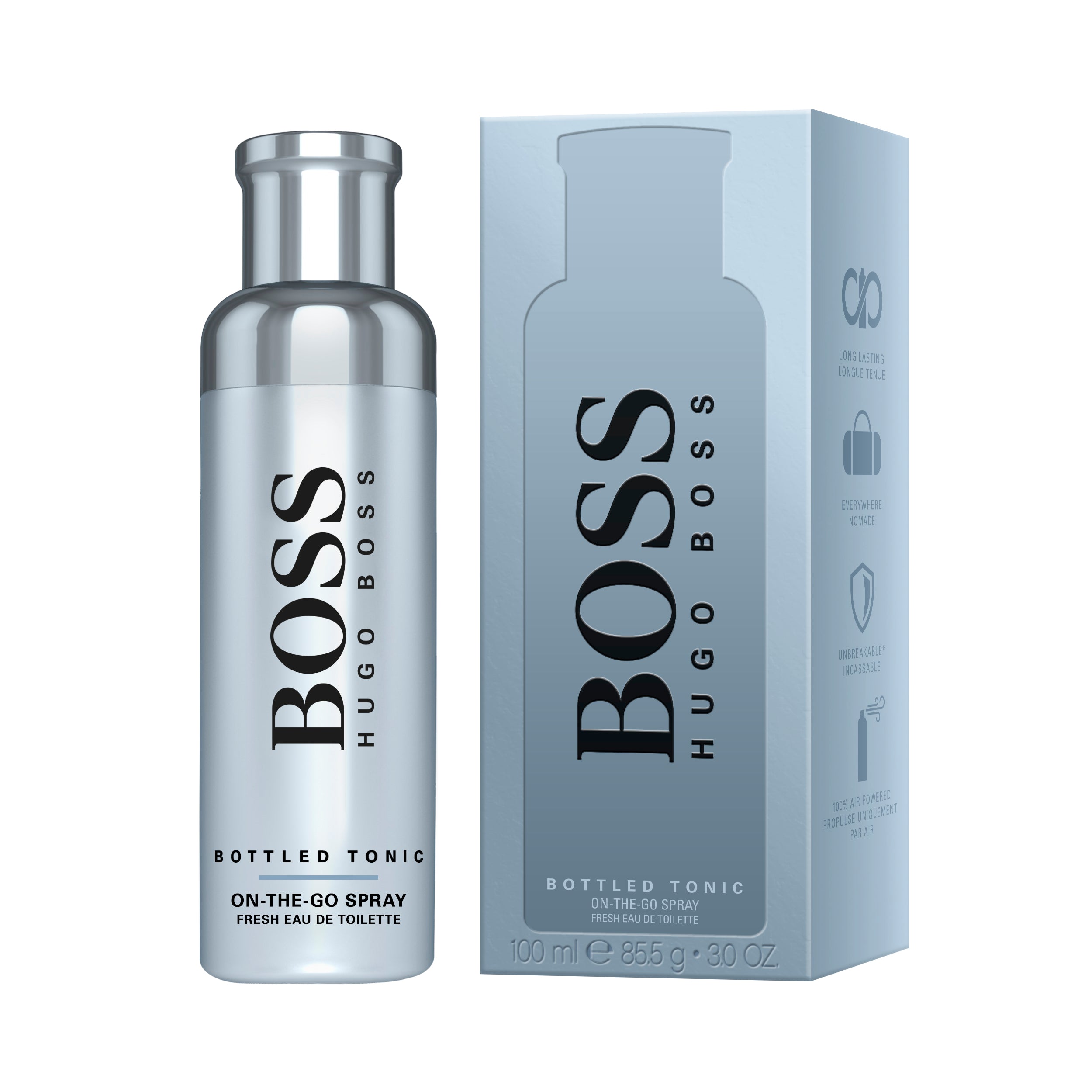 BOSS Bottled Tonic on-the-go spray, packaged in an unbreakable 100ml aluminium canister for a modern effect. The fresh eau de toilette inside the durable canister is 100% air-powered, delivering intense fragrance without the use of propellants. Ideal for active days, this invigorating scent combines citrus essences and wood notes.